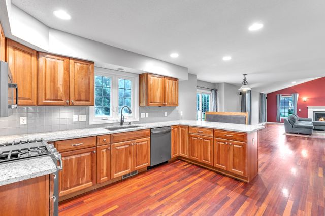 The heart of the home shines in the kitchen and living room, each a testament to thoughtful design. The kitchen is a chef’s dream, featuring sleek granite countertops, a stylish new sink, and generous counter space perfect for culinary creations. The adjoining living room is equally impressive with its soaring cathedral ceilings and a cozy fireplace, creating an inviting atmosphere for both relaxation and entertaining.