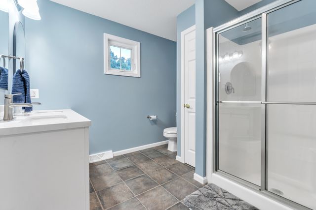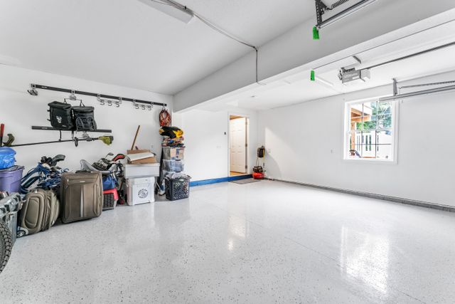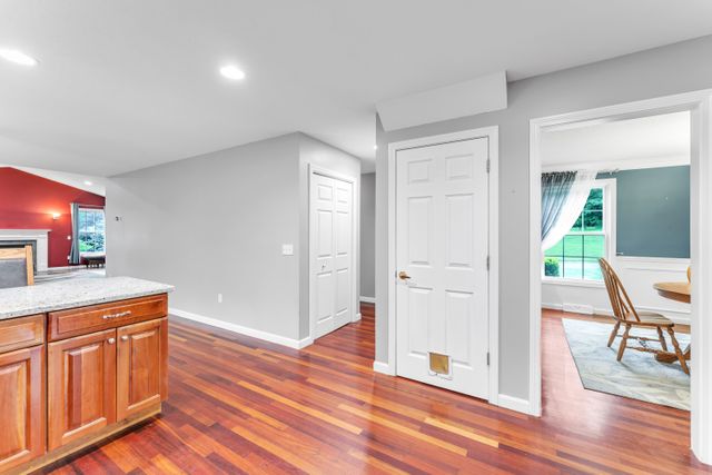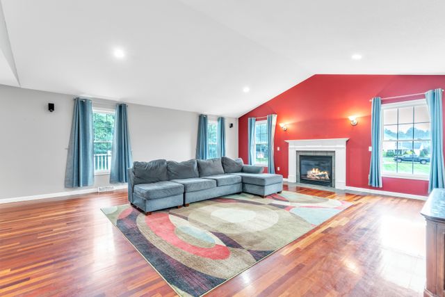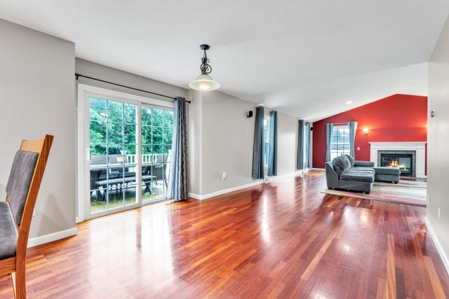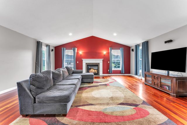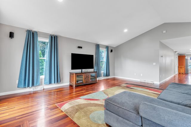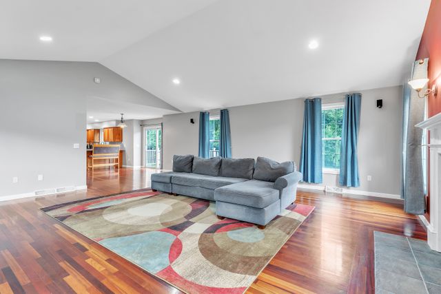 Stay comfortable throughout the year with a central AC unit installed in 2022. The expansive great room, enhanced by the same soaring cathedral ceilings and fireplace, opens through sliding doors to a large deck—ideal for summer BBQs and outdoor gatherings.