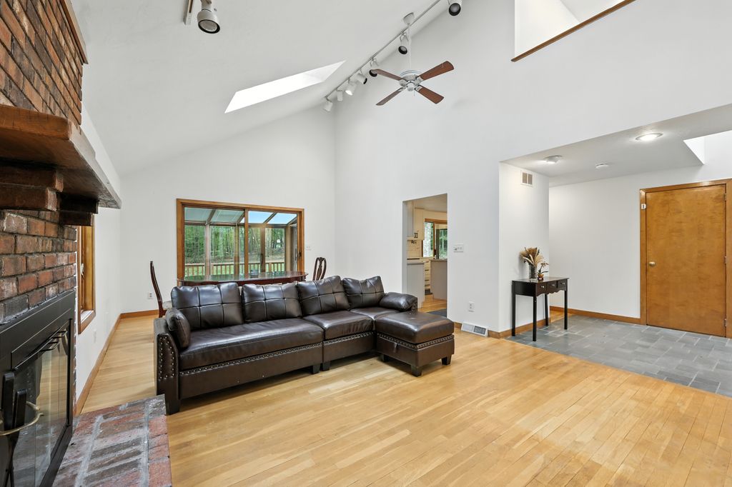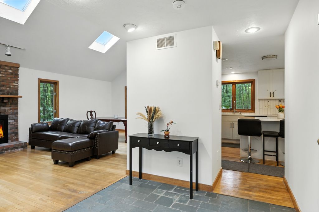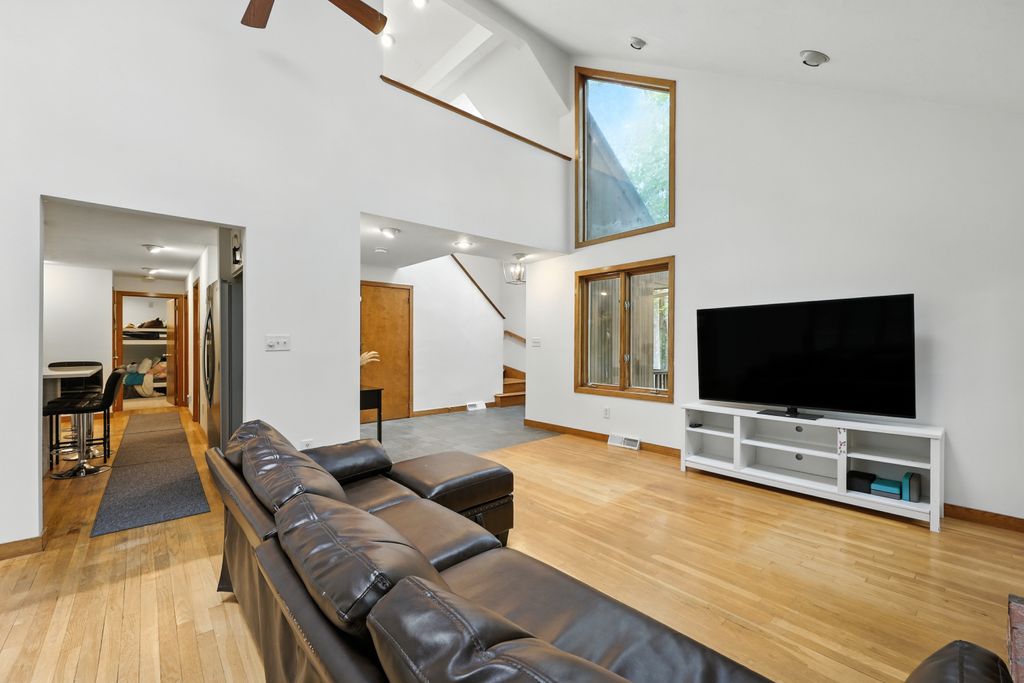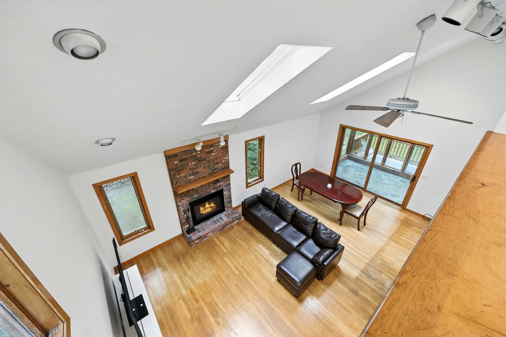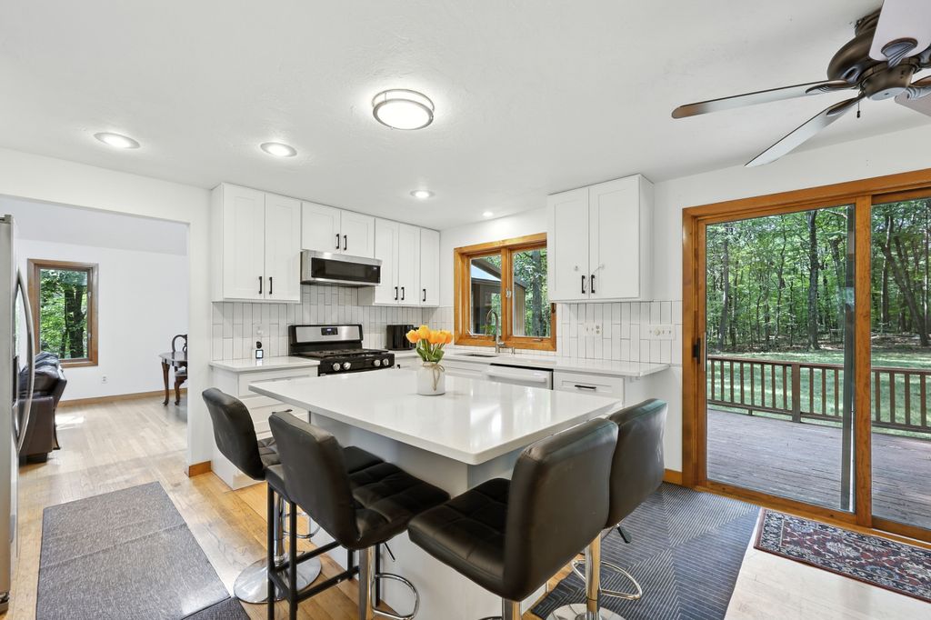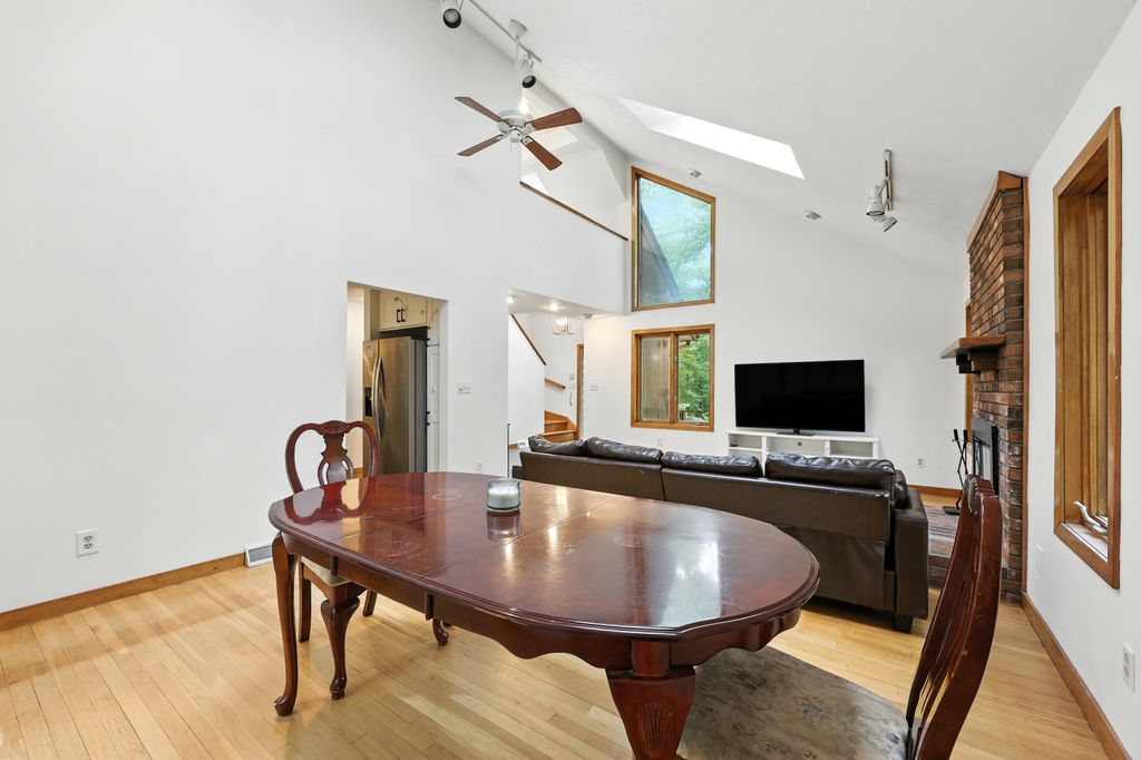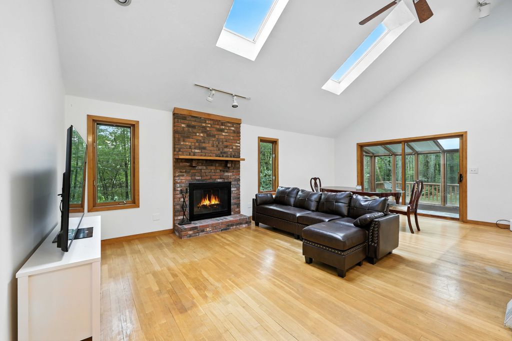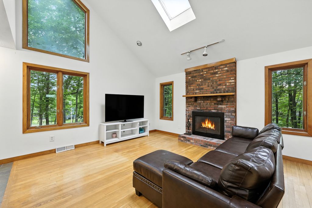 Tucked within a peaceful, wooded setting, this striking contemporary home offers 4 bedrooms, 3 baths, and 2,635 sq ft of beautifully designed living space. A two-car garage and mature trees frame the approach, while inside, cathedral ceilings and skylights bathe the main living area in natural light. The kitchen features sleek, newer appliances and invites culinary creativity. A brick fireplace with a commanding mantle anchors the living room. The main bedroom offers serenity beneath skylights, while a finished walkout basement with a full bath provides versatile space for work or leisure. Freshly painted decks and railings invite moments of quiet reflection amid the surrounding greenery. Ideal for those who value a tranquil lifestyle immersed in nature’s beauty.