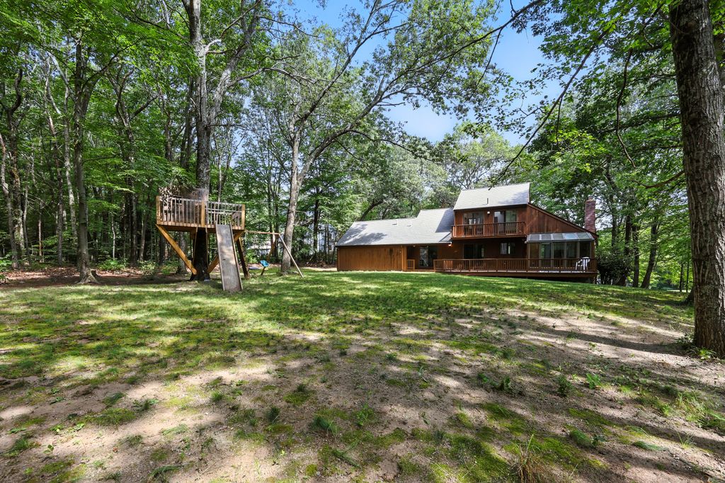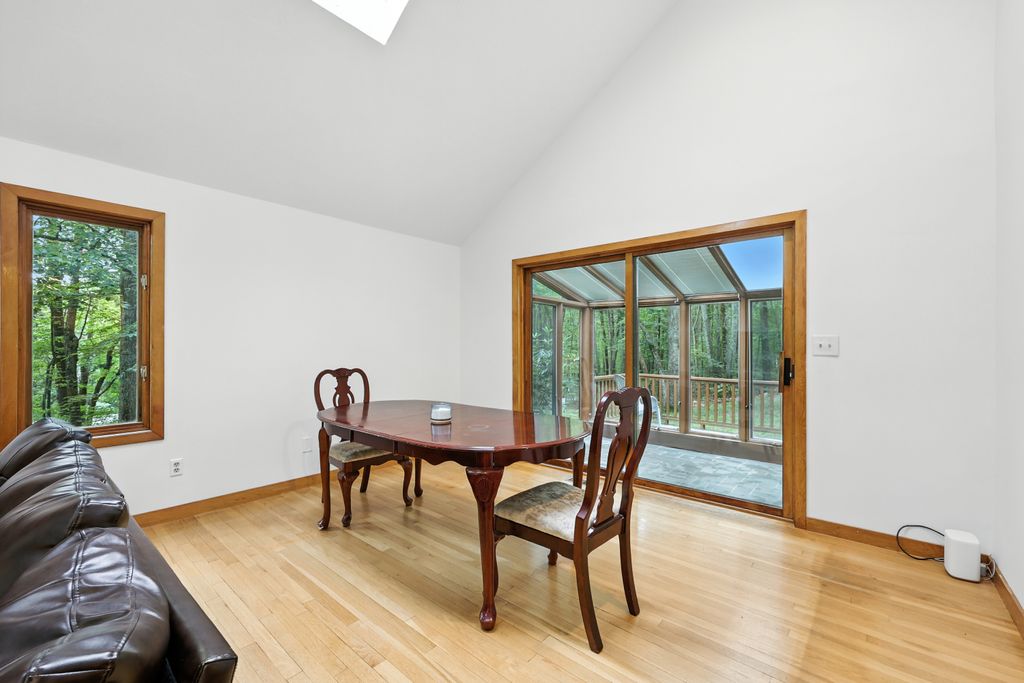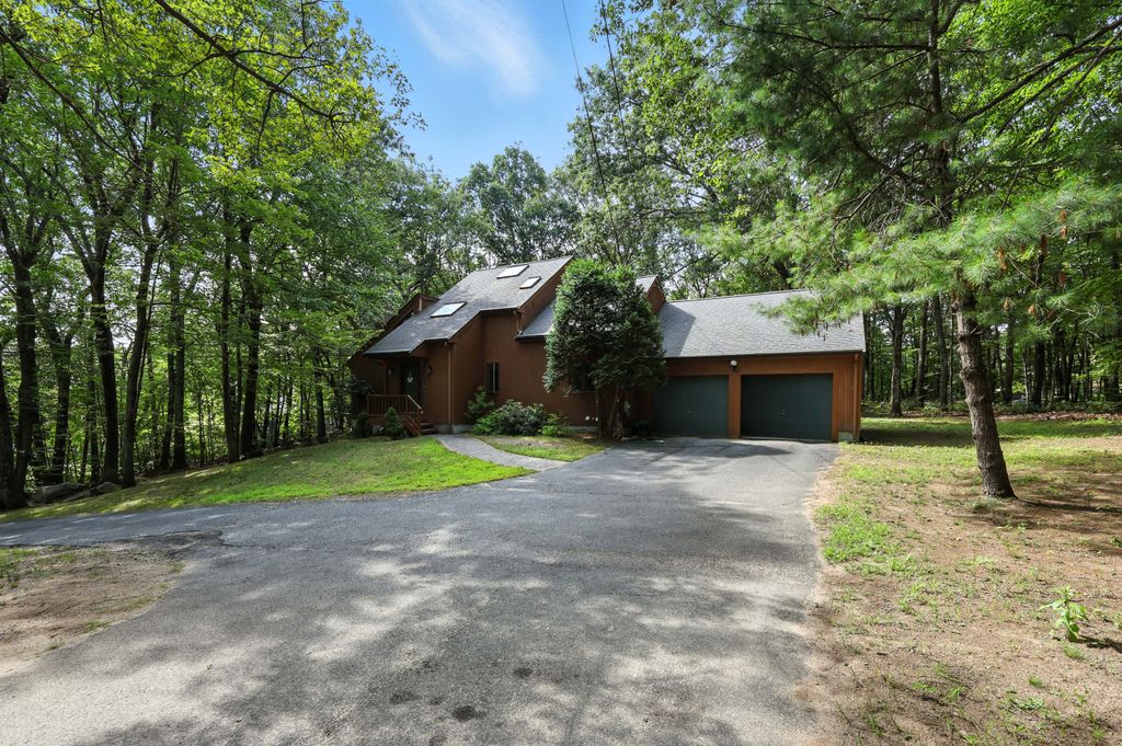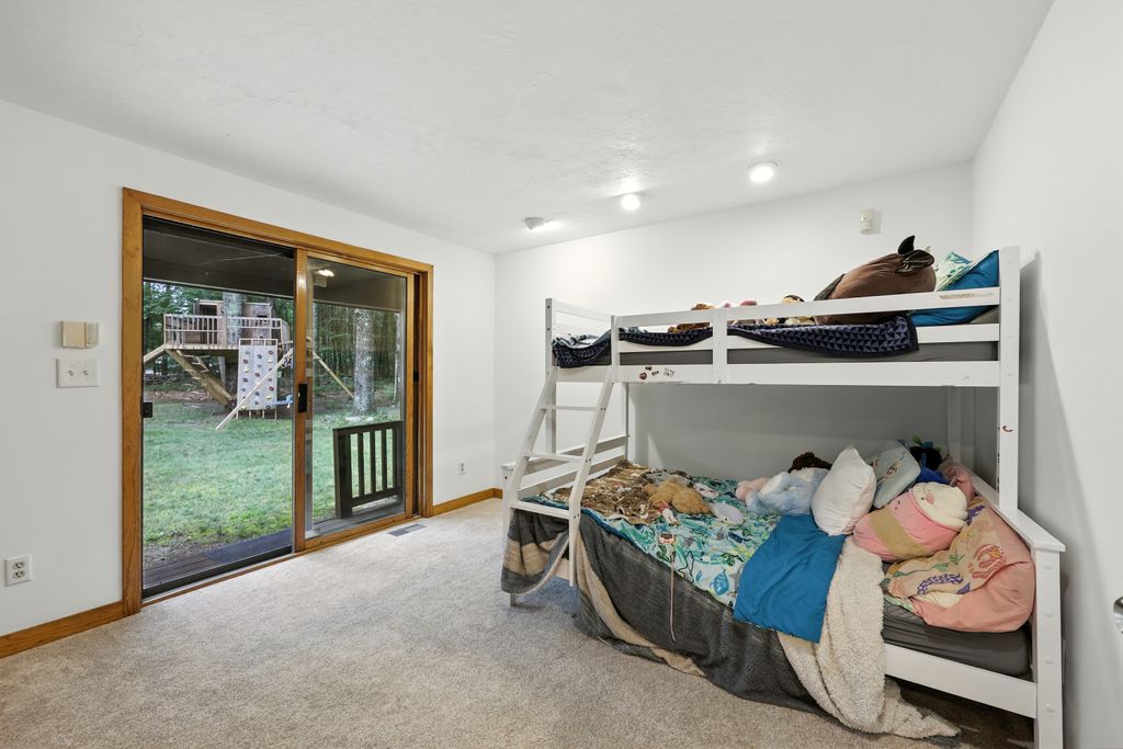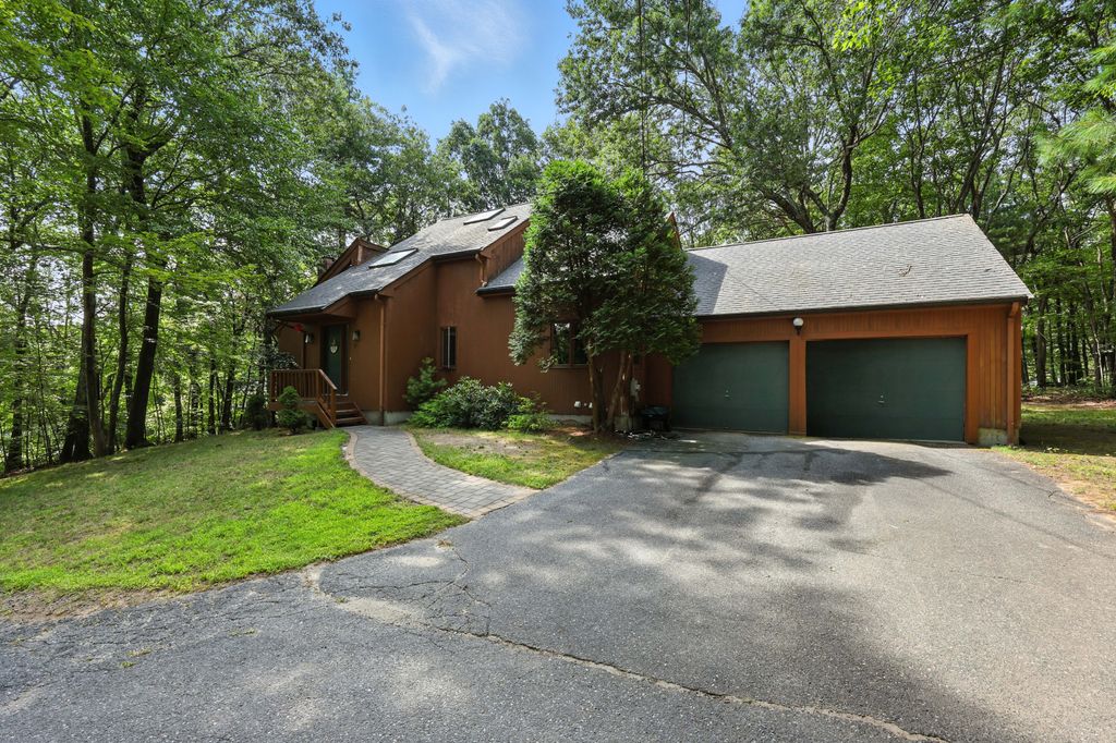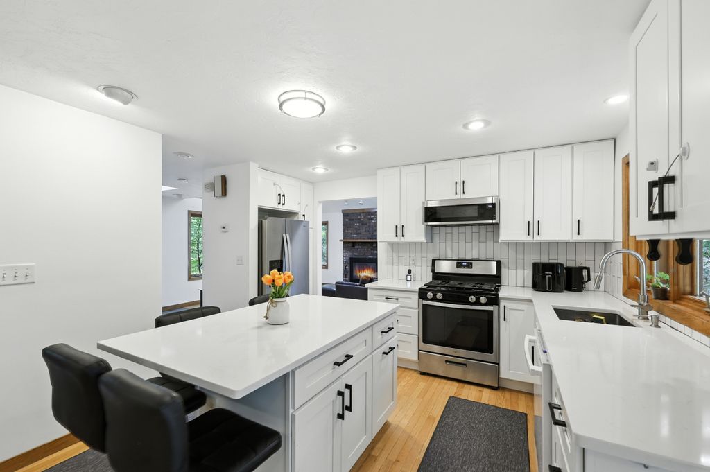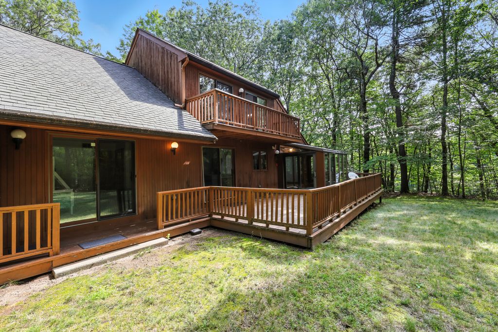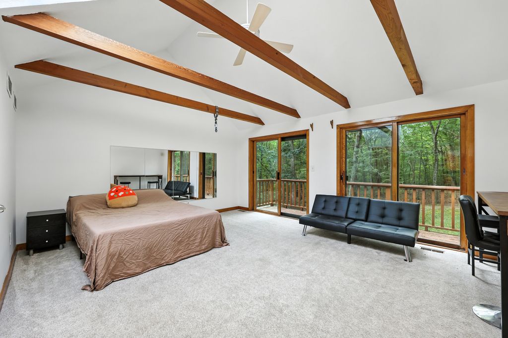 Tucked within a peaceful, wooded setting, this striking contemporary home offers 4 bedrooms, 3 baths, and 2,635 sq ft of beautifully designed living space. A two-car garage and mature trees frame the approach, while inside, cathedral ceilings and skylights bathe the main living area in natural light. The kitchen features sleek, newer appliances and invites culinary creativity. A brick fireplace with a commanding mantle anchors the living room. The main bedroom offers serenity beneath skylights, while a finished walkout basement with a full bath provides versatile space for work or leisure. Freshly painted decks and railings invite moments of quiet reflection amid the surrounding greenery. Ideal for those who value a tranquil lifestyle immersed in nature’s beauty.